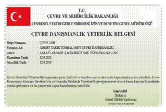 MNT Çevre Danışmanlık & Environmental Consulting, çevre mevzuatı kapsamında gerekli yükümlülüklerini yerine getirerek Çevre ve Şehircilik Bakanlığı’nın 12.08.2011 tarih ve ÇDYB-1506 belge numaralı yazısı ile Çevre Danışmanlık Yeterlik Belgesi almaya hak kazanmıştır.